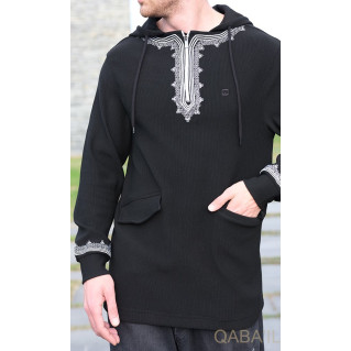 Qamis long en tissus jersey, ZIP sous le col et broderies crochetées à la poitrine et sur les poches.