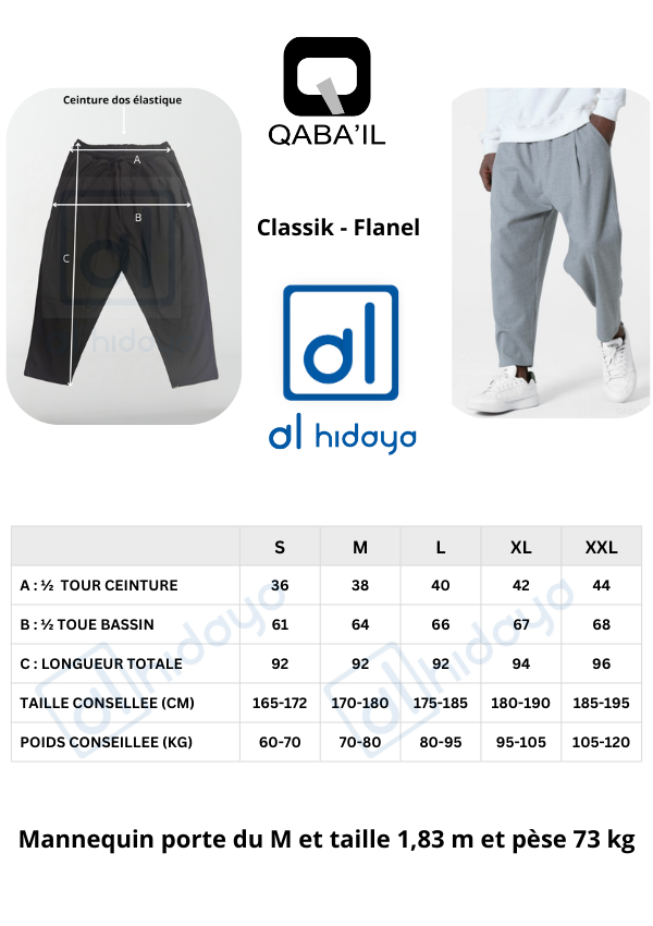Consultez le guide des tailles ci-dessous pour choisir votre Sarouel Classik Flanel Qaba’il avec précision.